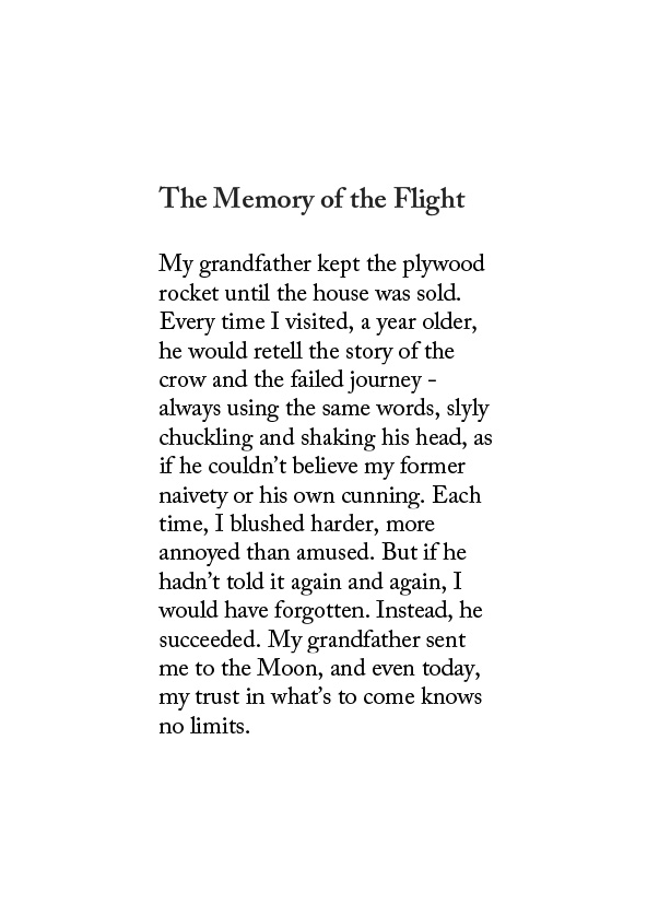 When I was little, my grandfather promised me a flight to the Moon — a story involving plywood, a black coat, and a crow on the electric wires. I believed him just enough to eat my dinner. The crow flew away. I stayed.